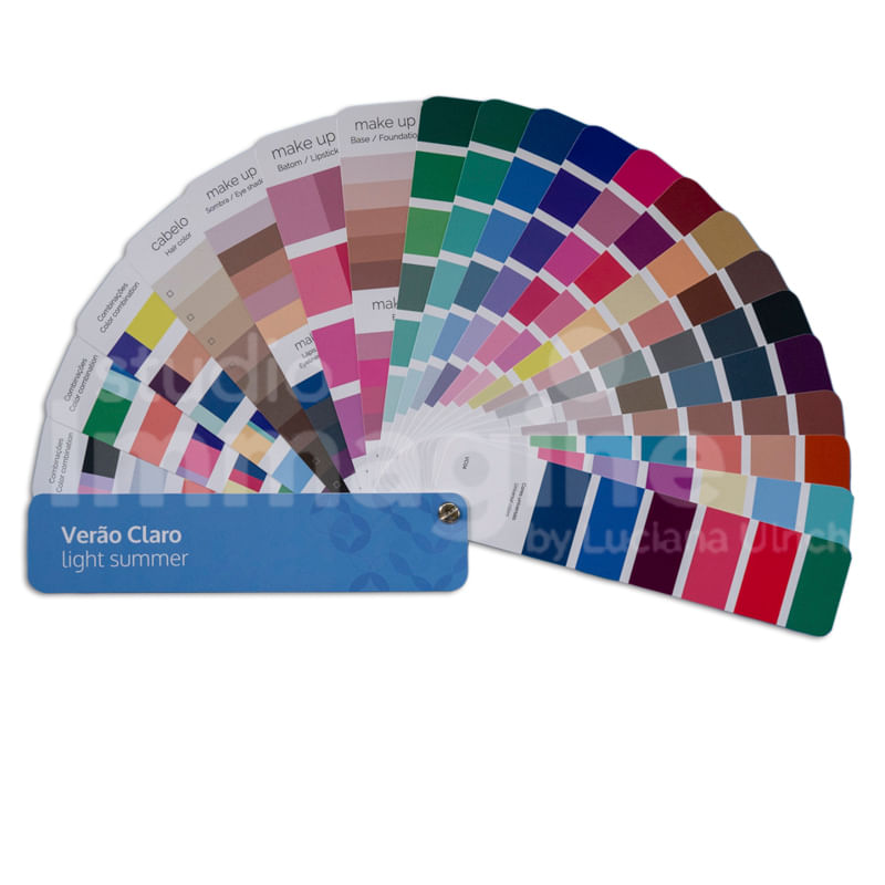 A Cartela Verão Claro é referência na consultoria de coloração pessoal para a escolha de maquiagens (sombras, batons, bases e máscara de cílios), coloração de cabelo, metais para acessórios e cores de roupas. O material traz as dimensões da cor no Método Sazonal Expandido e pesquisa de tendências da Studio Immagine, que avalia temperatura, intensidade, profundidade e contraste. A mais recente novidade das cartelas é a inclusão de um QR Code. Ao fotografar o QR com um aplicativo apropriado, você acessa informações práticas e exclusivas sobre a sua estação. Bem-vinda ao nosso universo colorido!