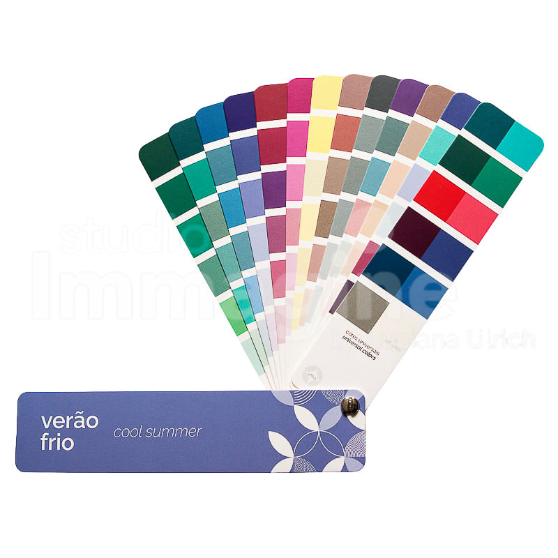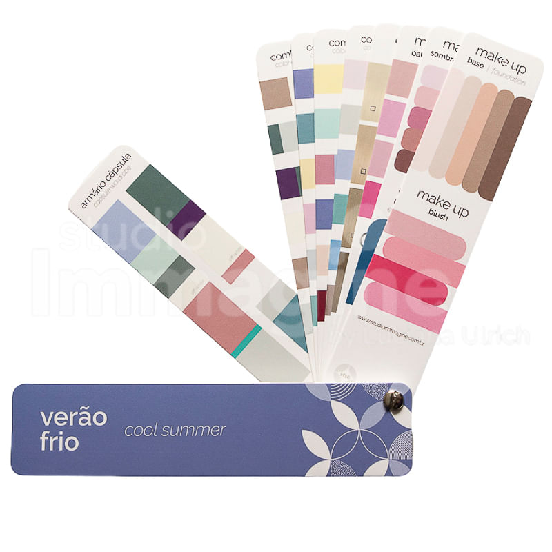Além disso, a cartela Verão Frio vem com as 12 cores universais, explicação do TIP da estação (temperatura, intensidade e profundidade), duas sugestões de combinações de cores para montar um armário cápsula, indicação dos melhores tons de cabelo, metais e acessórios e três lâminas com tons de make, entre blush, base, sombra, lápis, máscara e batons.